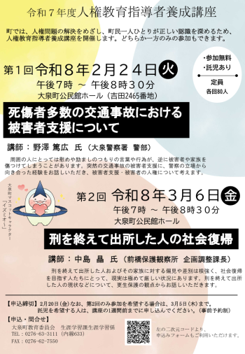 文化・教養公開日:2026年02月13日人権教育指導者養成講座開催日:2026年02月24日(火)、03月06日(金)