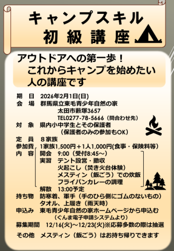 子ども・親子向け公開日:2025年12月21日「キャンプスキル初級講座」開催日:令和8年2月1日(日曜日) 《雨天実施》