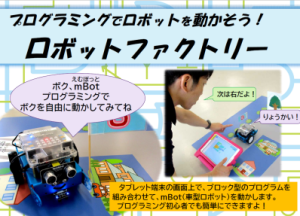 タブレット端末で簡単なプログラミングを学び、そのプログラムで教材用ロボット「mBot」を自分で動かす... -