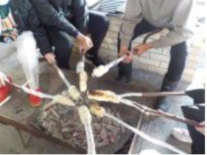 パン生地からつくり、棒に巻き付けたら、炭火で焼き上げ味わいます。