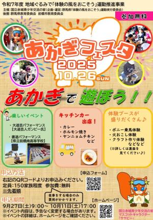 開催日:2025年10月26日(日)開催時間:10:00~14:00申込締切:2025年10月11日(土)国立赤城青少年交流の家では、今年も「あかぎフェスタ」を開催します。 【内容】 ・体験活動各種(ポニ...