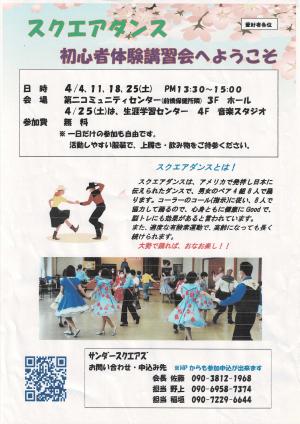 「サンダースクエアズ」は、群馬県内(前橋市を中心とする地域)のスクエアダンスを趣味とする人たちか集うサークルです。